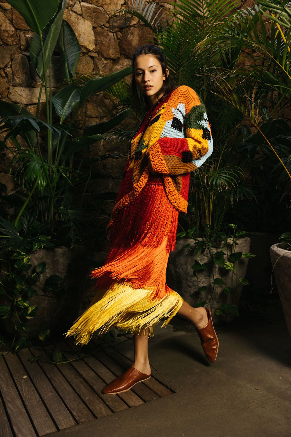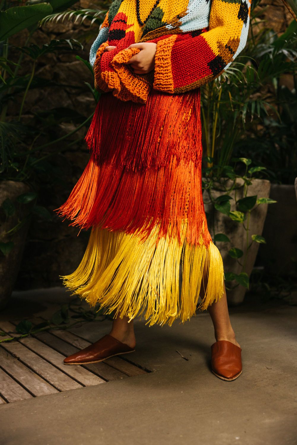 Pollera de crochet con tres capas de flecos. Elastico en cintura. Hilado de seda.
