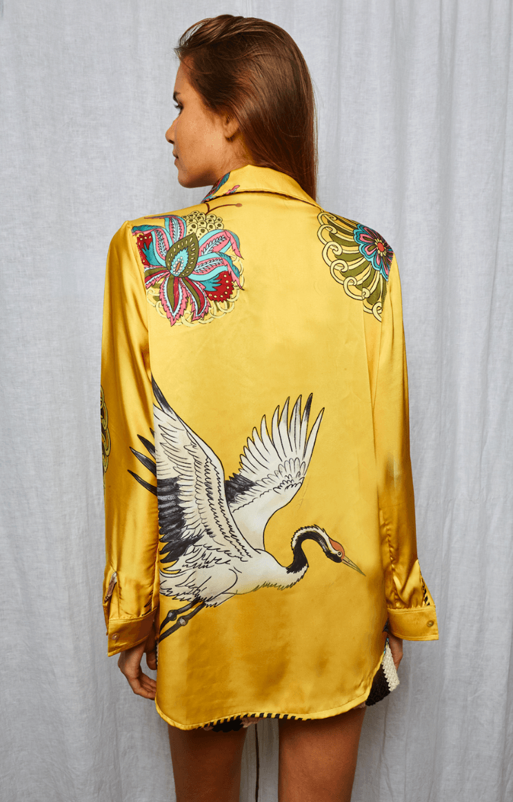 Camisa estampada holgada de corte clásico con cuello solapa y abotonada. Talle único. Similar a un M. Estampa the farra.