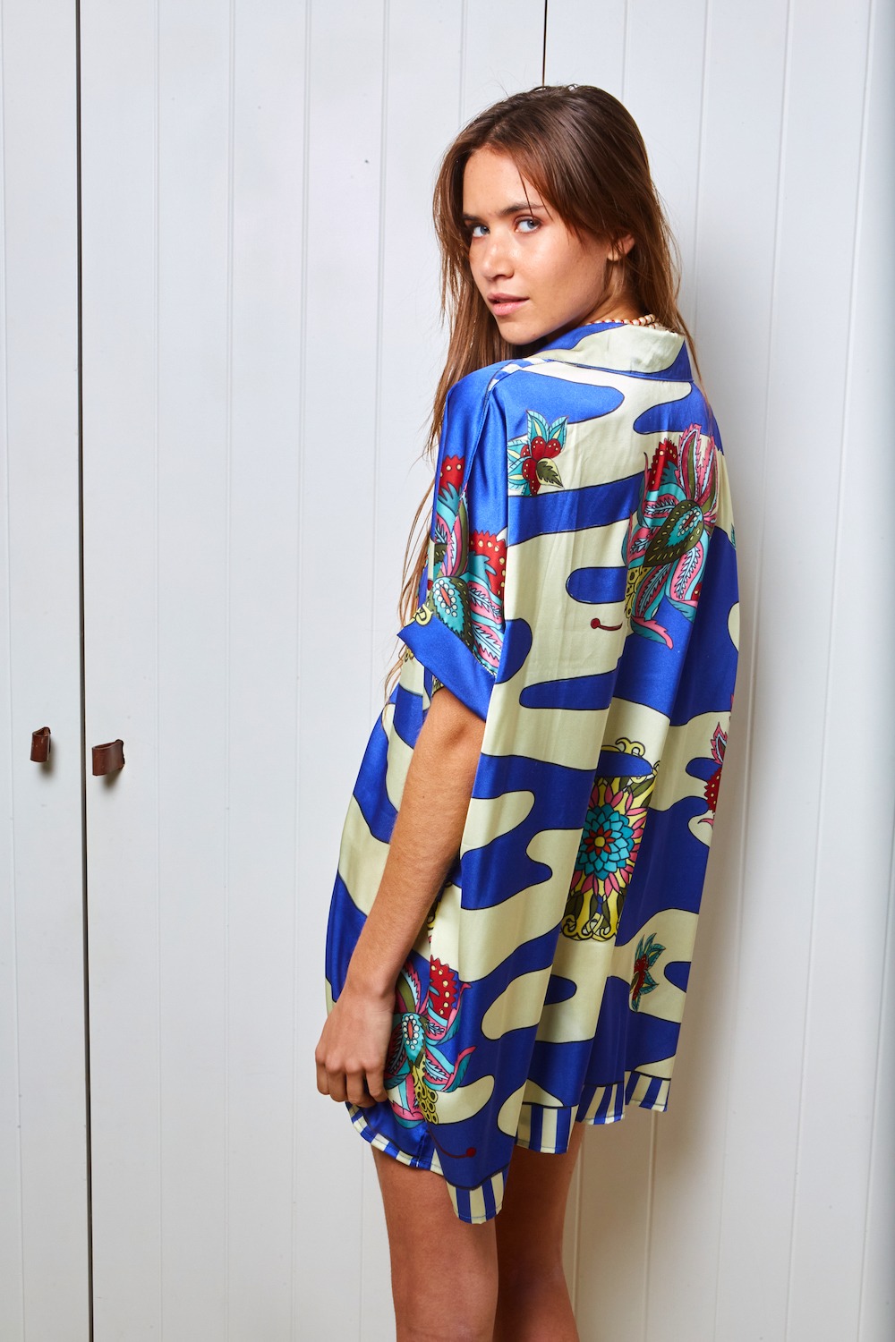 Camisola estampada en seda para usar 24/7, como camisa corta o vestido. Talle único, calce holgado. Estampa exclusiva the farra.