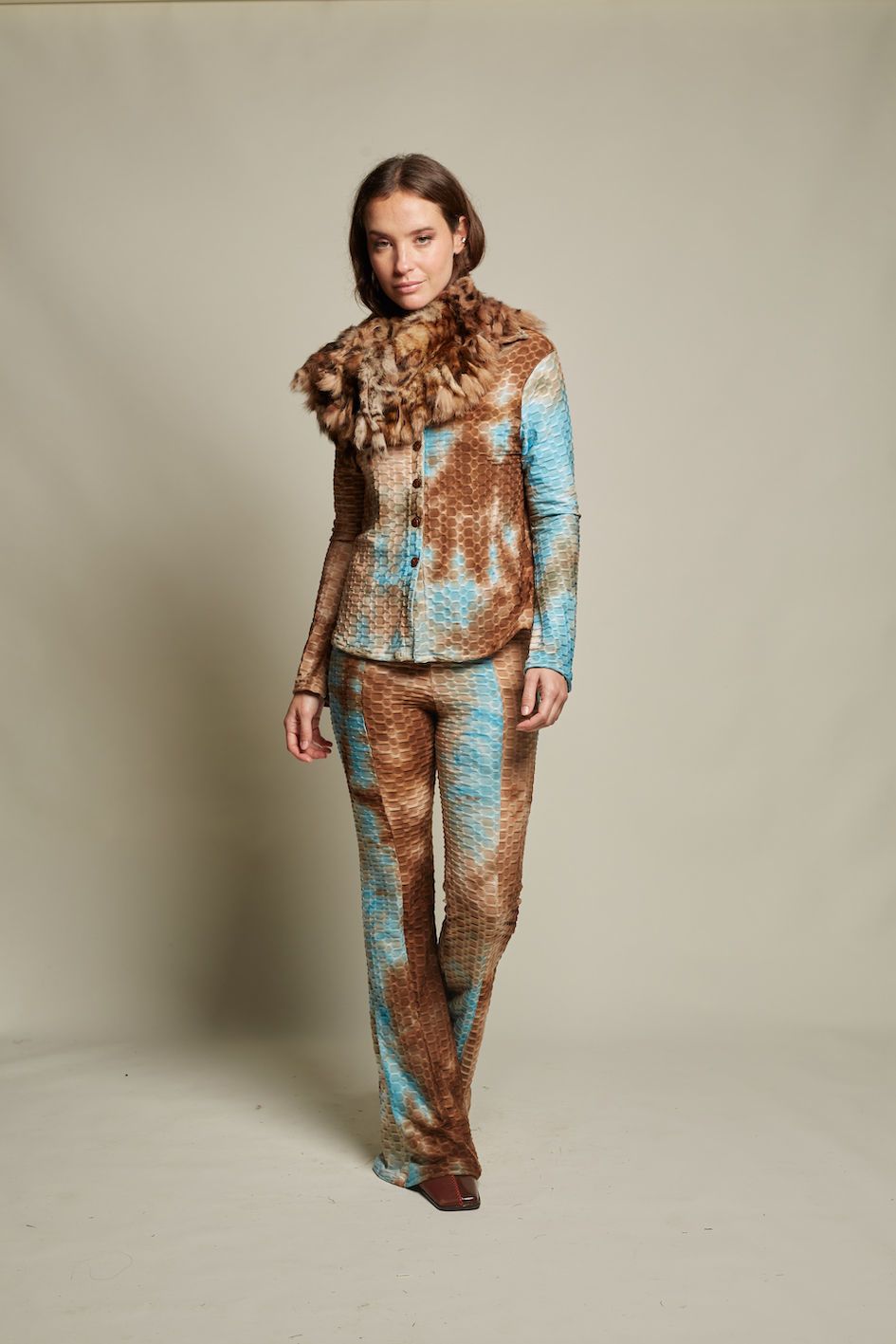 Camisa de genero elastizado texturada de corte clásico con cuello solapa y abotonada.