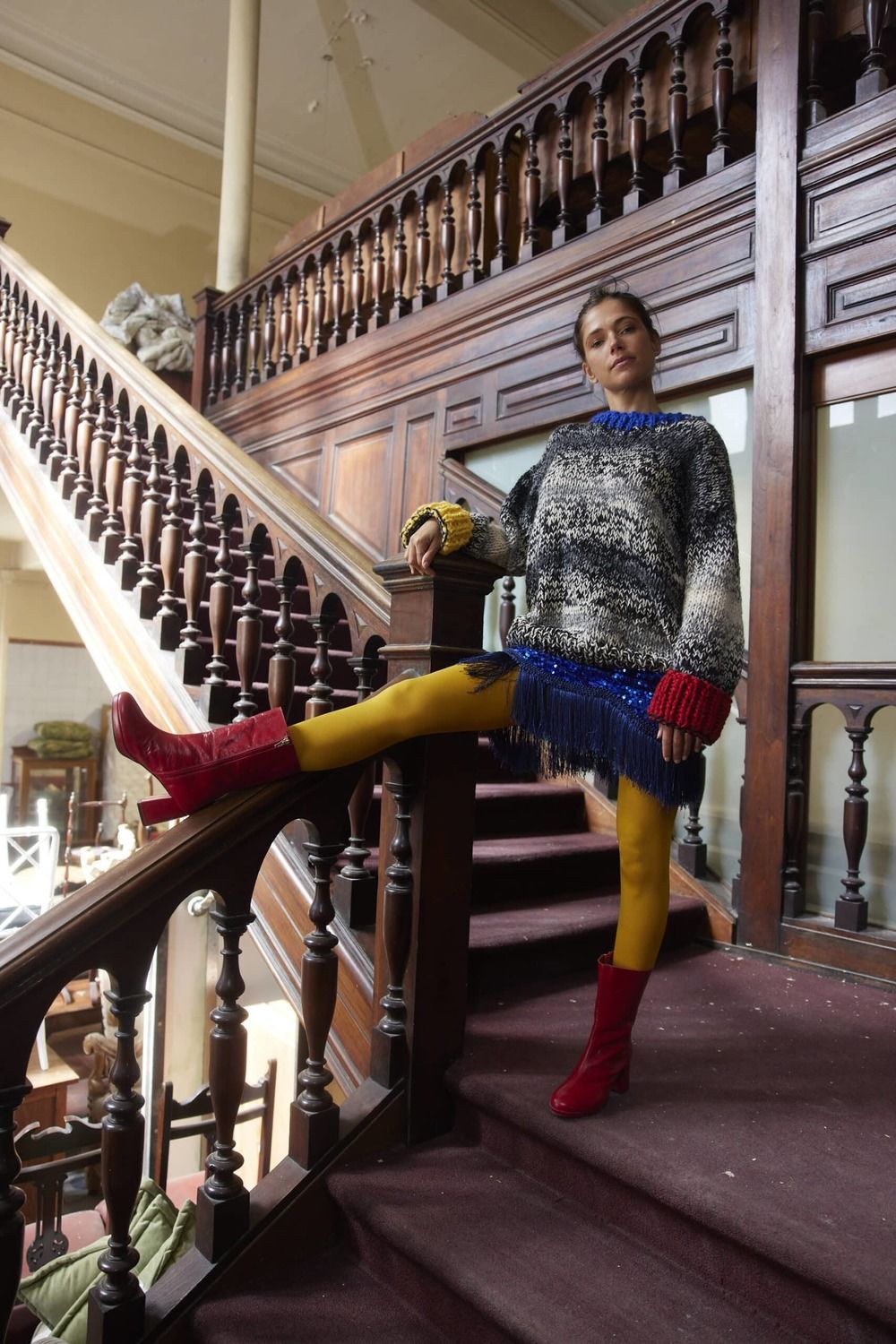 Pollera de lentejuelas azules con flecos de hilado de seda tejidos a mano.