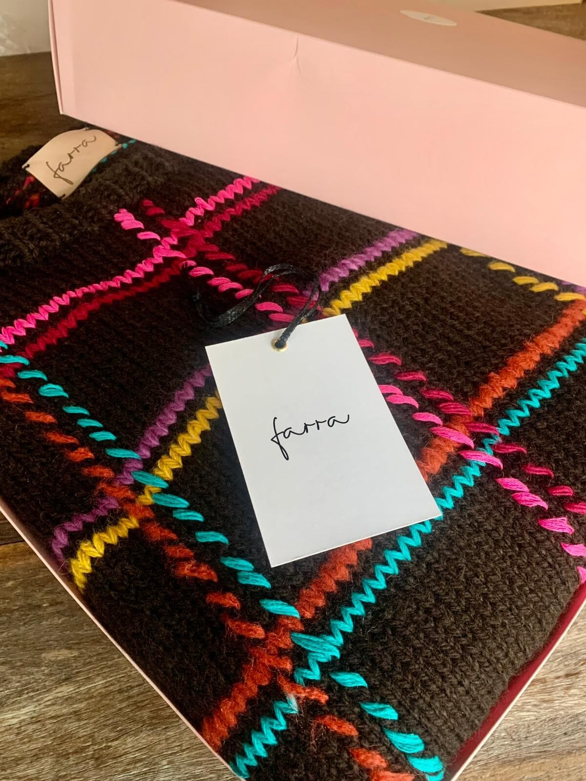 Sweater de lana tejido y bordado a mano en Uruguay de calce holgado con cuello a la base y puños. Talle único. Similar a un M/L.