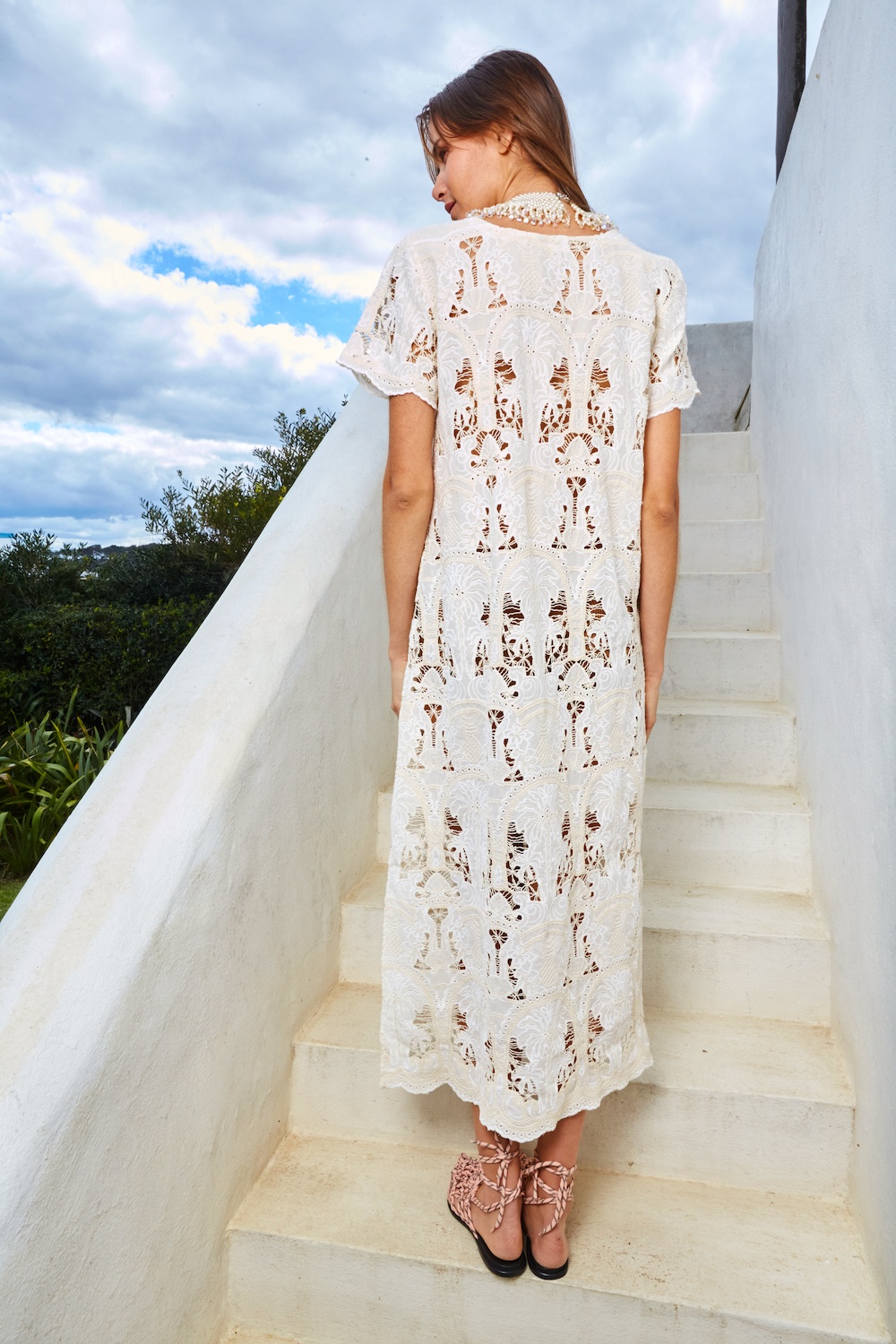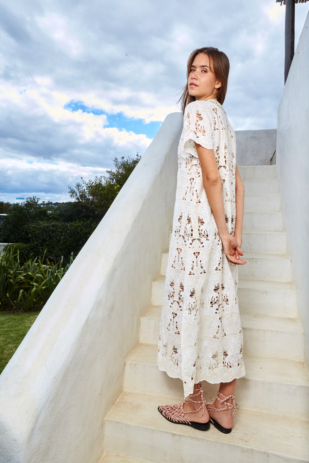 Vestido de cuello base, manga corta y corte evasé con tajo lateral en tela textura de encaje en 100% algodón.