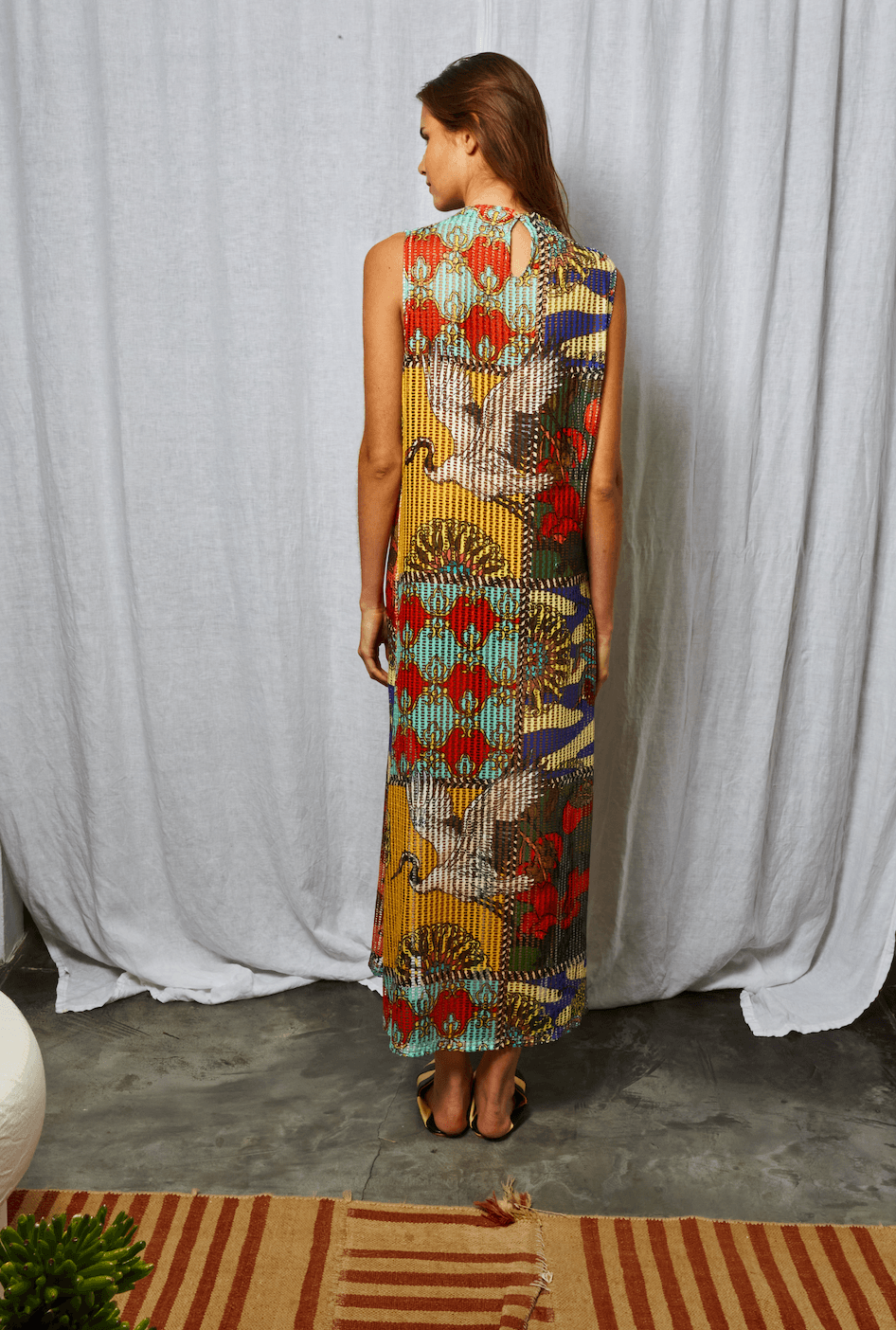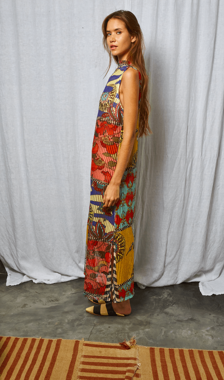 Vestido estampado con print exclusivo the farra. Tela calada, cuello alto que se abotona atrás, tajo lateral. Elastizado, se adapta a varios talles.